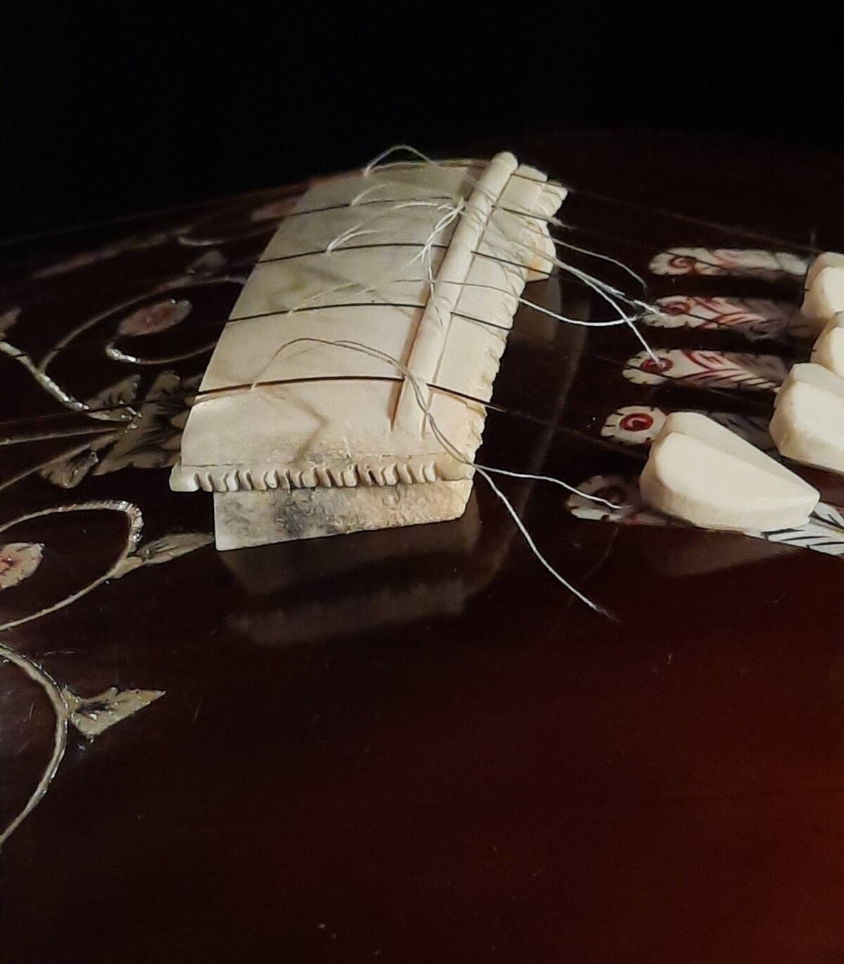 A rather large 5 stringed female tanpura has a beautifully balanced sound and is concert-ready. This instrument comes from Miraj and was originally imported by Shemmsuddin Import in Steyl. The instrument is as good as new but does have a few insignificant signs of use.