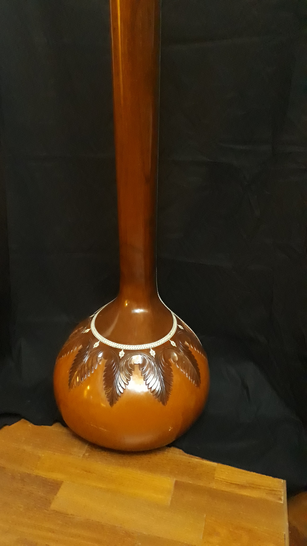 This beautiful Miraj female 4 stringed tanpura is simple in design. It has new strings, the pegs are checked and the bridge has a good sounding jawari. It has a scale length of 91cm and is presently tuned in G. There is no carrying case or cover supplied.