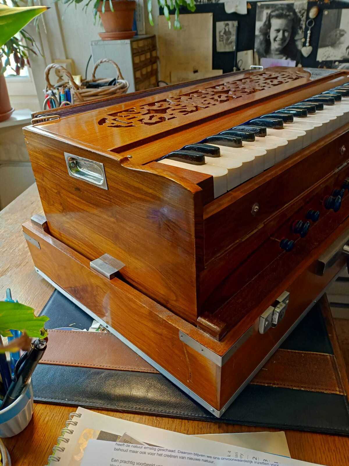 This simple, but beautiful folding harmonium once belonged to Ustad Zamir Khan. Professionally used. tuned perfectly in 440 hz. It has 2 reed sets. and is of excellent quality. It is in very good condition, and has a wonderful warm sound. The standing notes are not working. No scale changer nor copular.