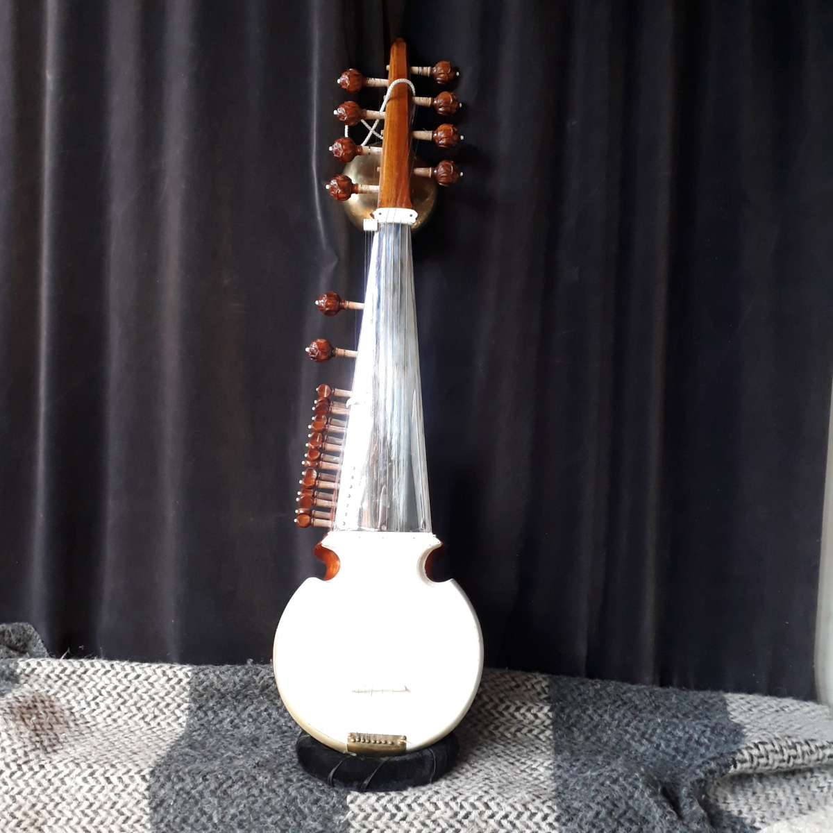 This great Ali Akbar Khan style sarod is in very good condition, presently tuned to C, It was brought from India in the eighties. The string length is 86 cm and the complete length of the instrument is 114 cm.
