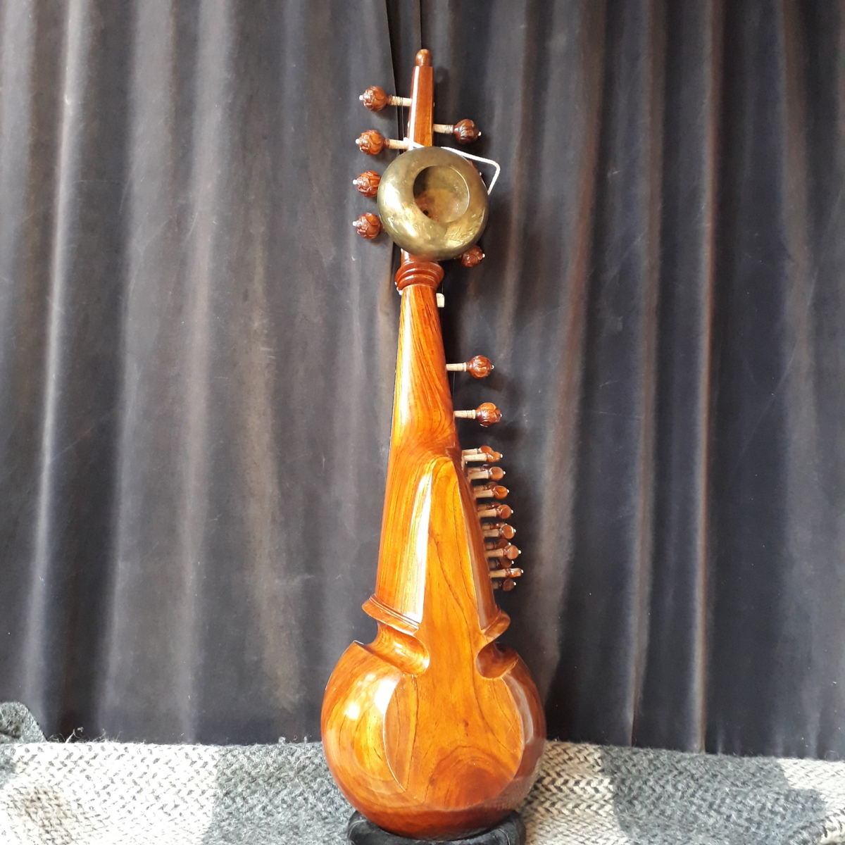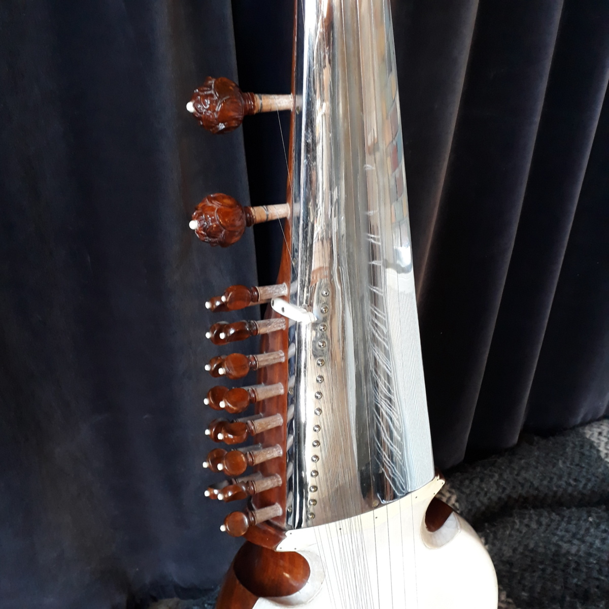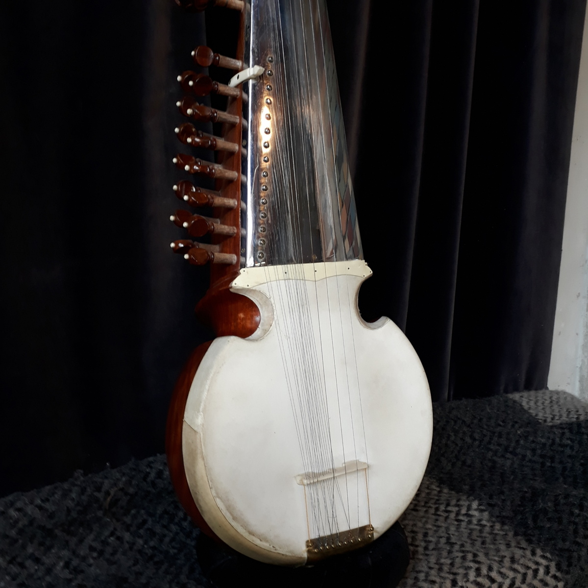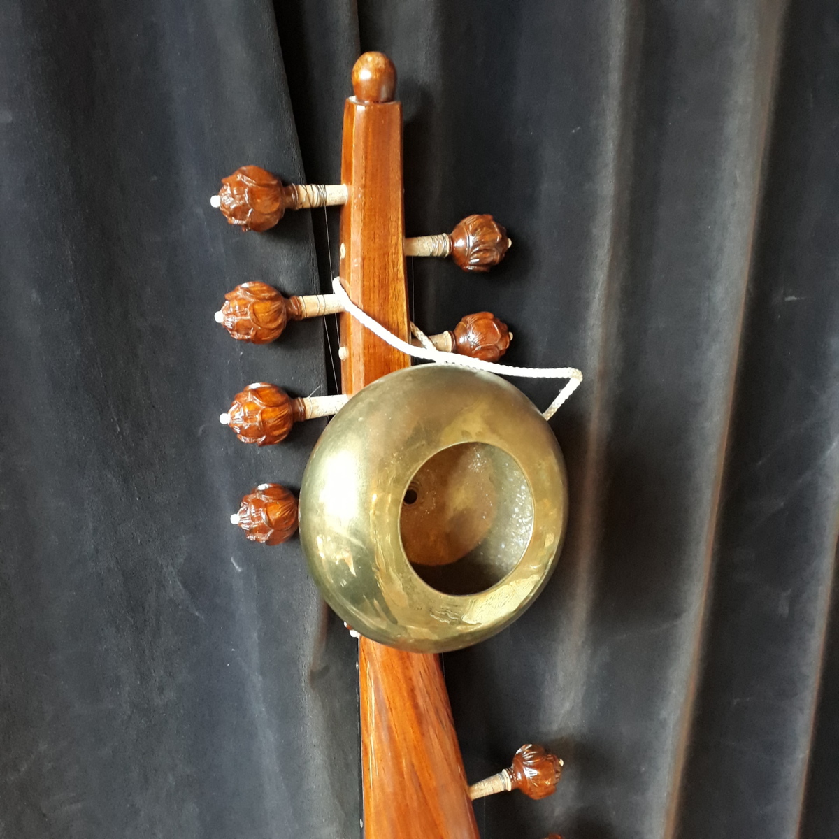 This great Ali Akbar Khan style sarod is in very good condition, presently tuned to C, It was brought from India in the eighties.  The string length is 86 cm and the complete length of the instrument is 114 cm.