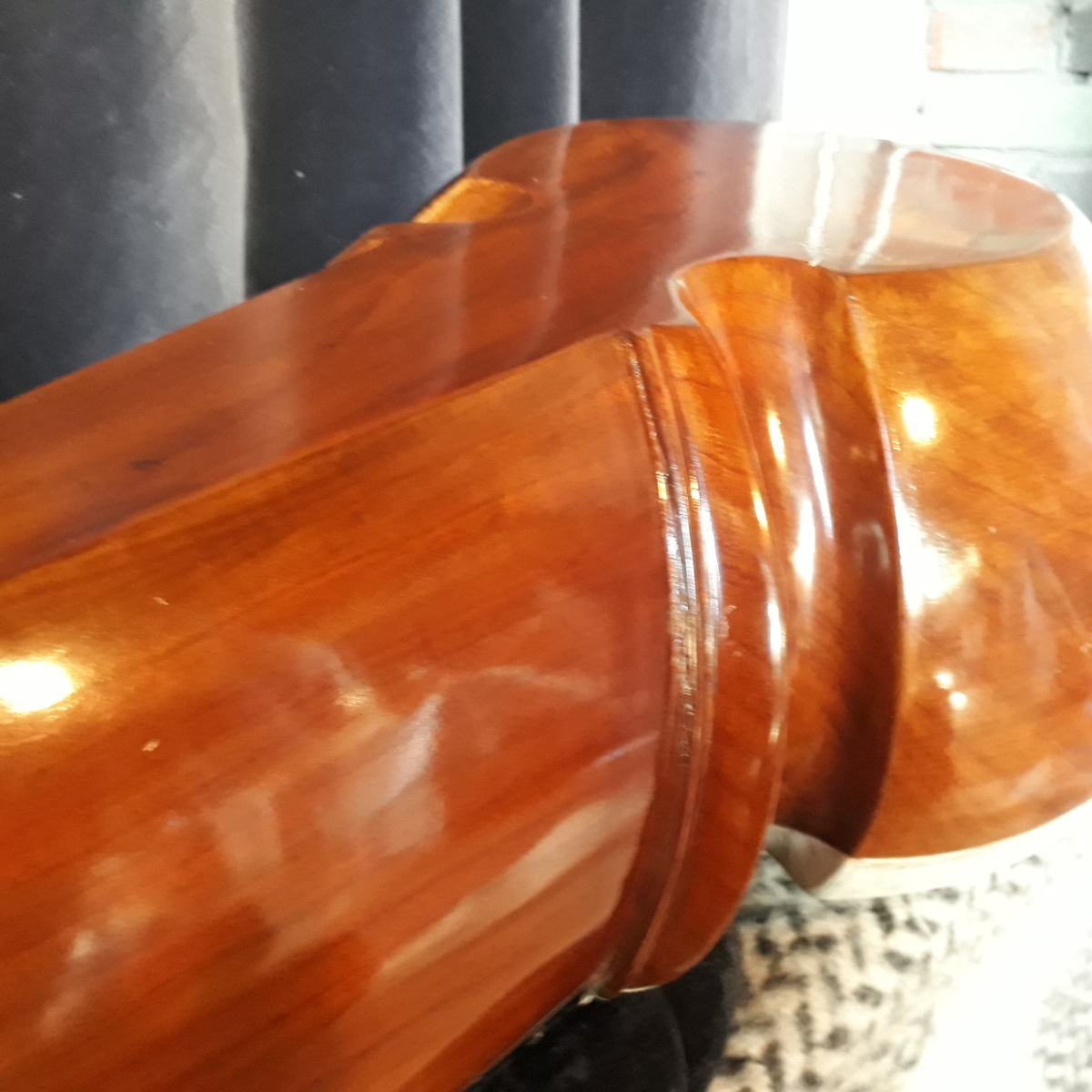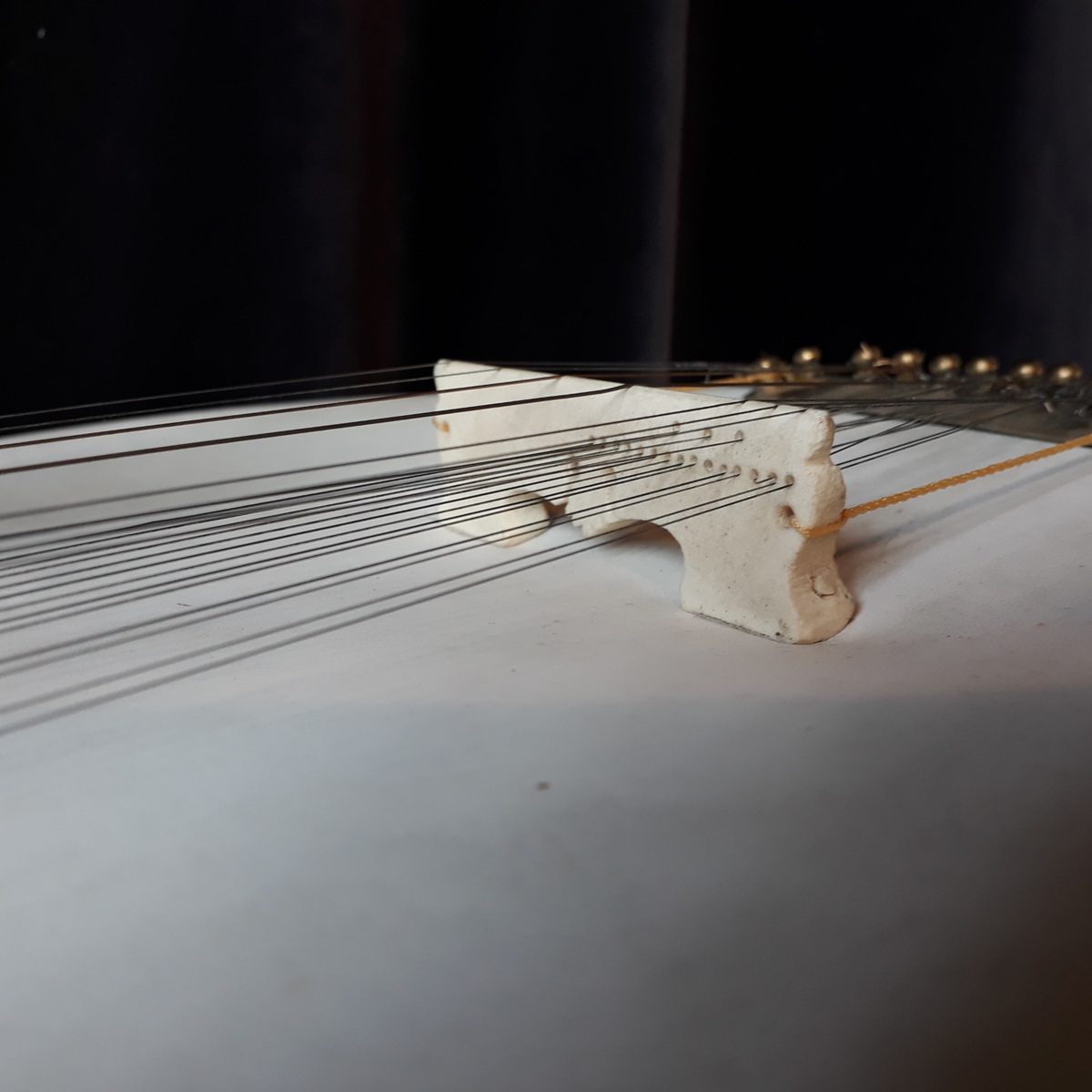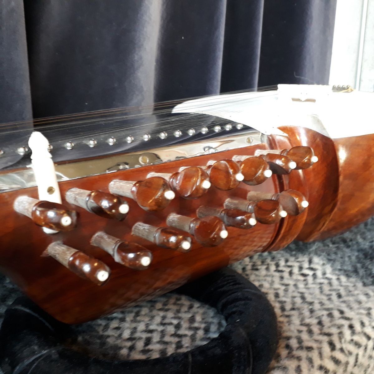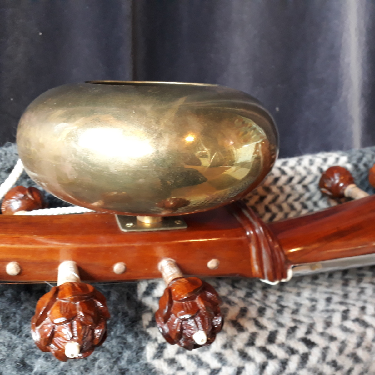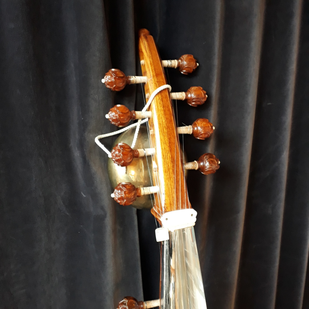 This great Ali Akbar Khan style sarod is in very good condition, presently tuned to C, It was brought from India in the eighties.  The string length is 86 cm and the complete length of the instrument is 114 cm.