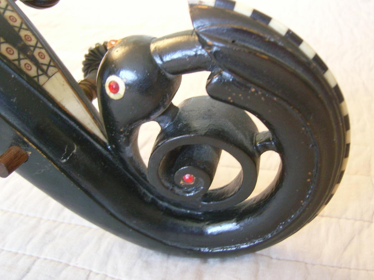 The photos that were made (not all in focus I'm afraid), were taken as it was found. I did not alter , renovate or even take off the broken strings. I saw the potential of the instrument for becoming a museum piece and left it in it's original condition. Therefore, unfortunately, I could not hear it played.