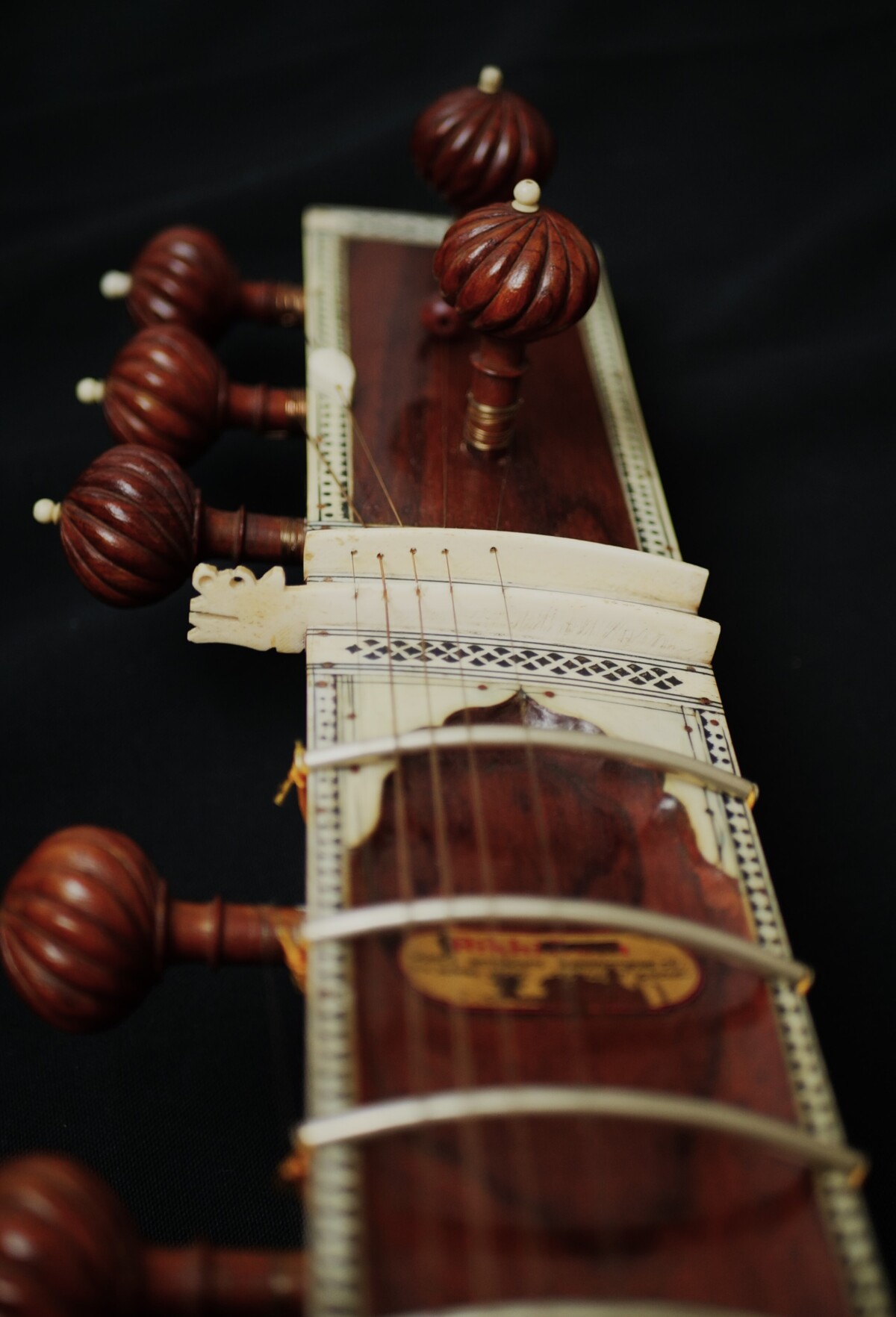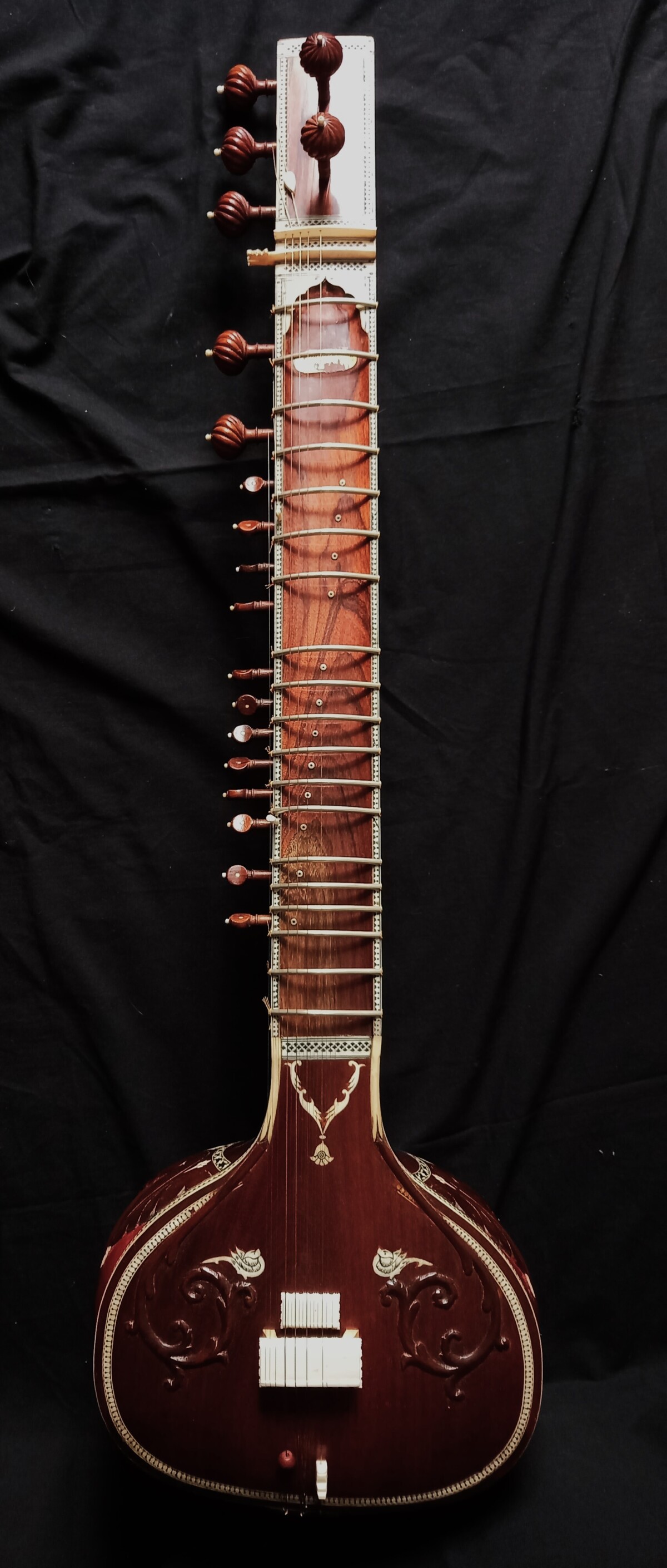 This wonderful vintage sitar was built by Rikhi Ram likely from the late-1950s to mid-1960s based on the badge, binding, and other attributes. This has been clarified by the experts. It has been professionally checked and has a new bridge. Presently in the Ravi Shankar style, it has a warm and full sound.
